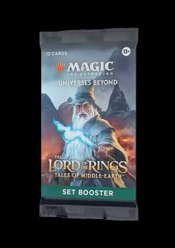 The Lord of the Rings: Tales of Middle-earth Set Booster Box contains 30 The Lord of the Rings: Tales of Middle-earth Set Boosters and 1 Traditional Foil Box Topper card. Each Set Booster contains 12 Magic cards, 1 Art Card, and 1 token/ad card, Helper card, or card from The List (a special card from Magic’s historyfound in 25% of packs).